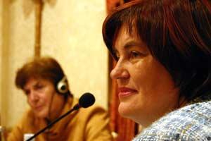 Hannelore Valier Head of the Mission's Democratization Department (left) and acting President of the Mitrovica District Court Branka Bancevic, at a press conference aimed at promoting work in the field of human trafficking, Belgrade, 1 November 2005.
