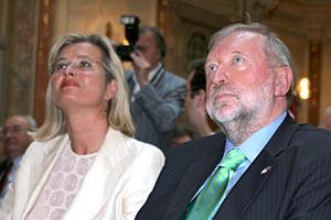 The OSCE Chairman Dimitrij Rupel (R) with Austrian Foreign Minister Ursula Plassnik, at a conference in Vienna, 20 July 2005, marking the 30th anniversary of the Helsinki Final Act.