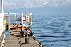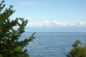 Snow capped mountain peaks shine from across Lake Issyk-Kul in northern Kyrgyzstan.