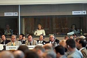 Sitting in booths behind delegations, interpreters at work at an OSCE Permanent Council at the Hofburg in Vienna, 21 July 2005. English, French, German, Italian, Russian and Spanish are the official OSCE languages.