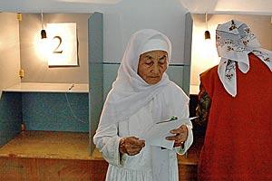 Voters at a polling station in Bishkek during the presidential election in Kyrgyzstan, 10 July 2005.