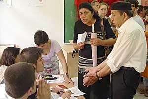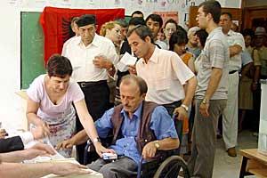 Voters line up to cast their ballots at a polling station in Tirana during parliamentary elections in Albania, 3 July 2005.