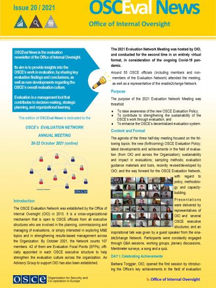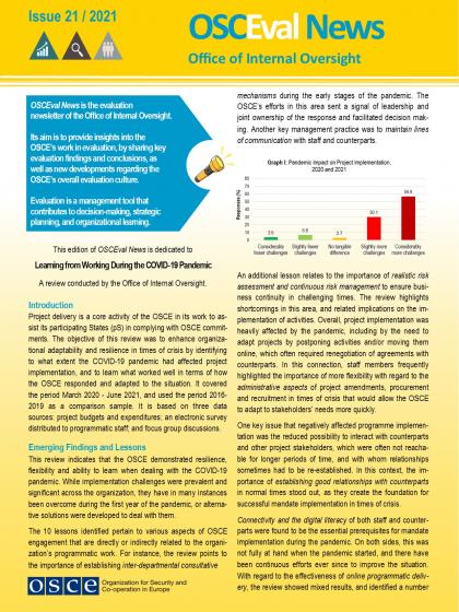 This edition of OSCEval News is dedicated to 'Learning from Working During the COVID-19 Pandemic'. This review covers the period March 2020- June 2021 and was conducted by the Office of Internal Oversight (OIO) to assess to what extent the COVID-19 pandemic had affected project implementation in the OSCE, while identifying lessons learned related to organizational adaptability and resilience.