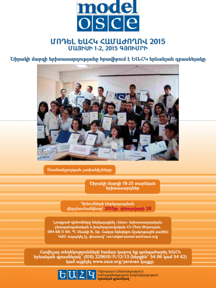 Poster announcing the Call for Applications for the Model OSCE Conference to take place in Gyumri, Shirak province of Armenia, on 1-2 May 2015. Available in Armenian only.
