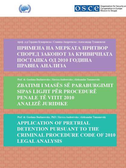 This analysis of the practical application of pretrial detention, as well as of the theoretical legal framework laid down in the Criminal Procedure Code1 of 2010 (hereinafter referred to as CPC 2010), which introduced conceptual reforms of national criminal procedure legislation, introducing elements typical of accusatorial systems, is the result of the cooperation between the Macedonian Association of Criminal Law and Criminology and the OSCE Mission to Skopje Rule of Law Department. The information in the analysis refer to the first nine months of enforcement of the CPC 2010, namely to the period between 1 December 2013 and 31 August 2014, and to four basic courts (Bitola, Gostivar, Skopje and Shtip). The publication is in English, Macedonian and Albanian languages.