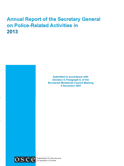 The Annual Report of the Secretary General on Police-Related Activities in 2013, submitted in accordance with Decision 9, paragraph 6, of the 2001 Bucharest Ministerial Council Meeting, provides an overview of the police-related programmes and projects, implemented by the OSCE executive structures, including the thematic units in the Secretariat, the Institutions and the field operations, during 2013.