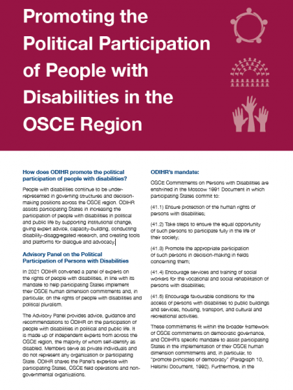 People with disabilities continue to be under-represented in governing structures and decision-making positions across the OSCE region. ODIHR assists participating States in increasing the participation of people with disabilities in political and public life by supporting institutional change, giving expert advice, capacity-building, conducting disability-disaggregated research, and creating tools and platforms for dialogue and advocacy.