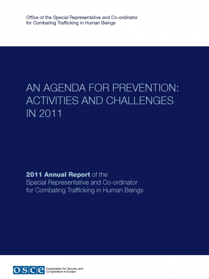 This Annual Report of the Special Representative and Co-ordinator for Combating Trafficking in Human Beings comprises of two main parts. Part I, An Agenda for Prevention: Activities and Challenges in 2011 is an overview of the main OSCE anti-trafficking activities. Part II has a special thematic focus on trafficking for labour exploitation and contains three experts’ essays which build upon the 11th Alliance against Trafficking in Persons Conference on “Preventing Trafficking in Human Beings for Labour Exploitation: Decent Work and Social Justice” (20- 21 June 2011). Both parts have a single conceptual framework: an agenda for prevention of trafficking in human beings.