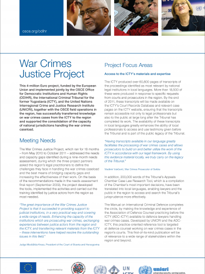 This 4-million Euro project, funded by the EU and implemented jointly by ODIHR, the International Criminal Tribunal for the former Yugoslavia (ICTY), and the UN’s Interregional Crime and Justice Research Institute (UNICRI), together with the OSCE field operations, successfully transferred knowledge on war crimes cases from the ICTY to the region and supported the consolidation of the capacity of national jurisdictions handling the war crimes caseload.