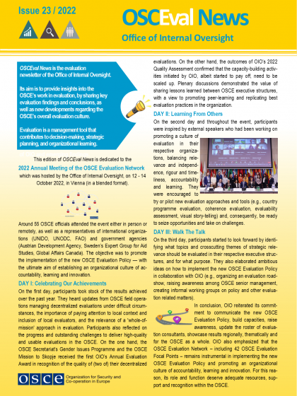 This edition of OSCEval News is dedicated to the 2022 Evaluation Network Annual Meeting. This blended event was hosted by the Office of Internal Oversight (OIO) from 12 to 14 October 2022, at the Hofburg, in Vienna.
