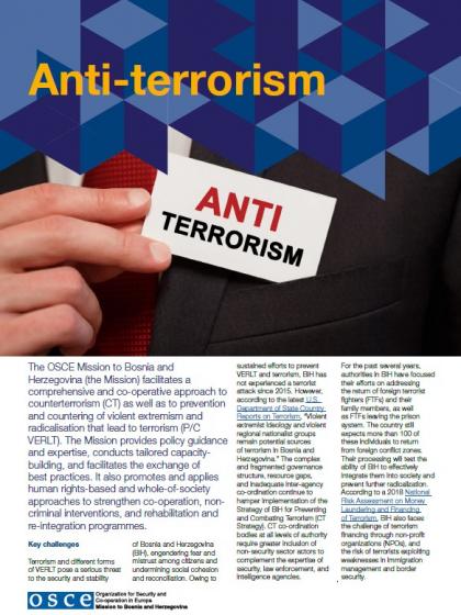 The OSCE Mission to Bosnia and Herzegovina (the Mission) facilitates a comprehensive and co-operative approach to counterterrorism (CT) as well as to prevention and countering of violent extremism and radicalisation that lead to terrorism (P/C VERLT). The Mission provides policy guidance and expertise, conducts tailored capacity building, and facilitates the exchange of best practices. It also promotes and applies human rights-based and whole-of-society approaches to strengthen co-operation, non criminal interventions, and rehabilitation and re-integration programmes.
