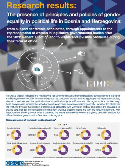 Research results: The presence of principles and policies of gender equality in political life in Bosnia and Herzegovina, from support for female candidates, through appointments to the representation of women in legislative governmental bodies after the 2022 General Election and to visible and invisible obstacles during their term of office.