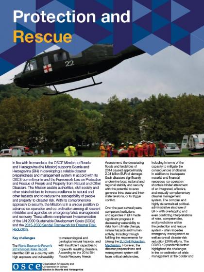 n line with its mandate, the OSCE Mission to Bosnia and Herzegovina (the Mission) supports Bosnia and Herzegovina (BiH) in developing a reliable disaster preparedness and management system in accord with its OSCE commitments and the Framework Law on Protection and Rescue of People and Property from Natural and Other Disasters. The Mission assists authorities, civil society and other stakeholders to increase resilience to natural and other hazards and to reduce the susceptibility of people and property to disaster risk. With its comprehensive approach to security, the Mission is in a unique position to advance co-operation and co-ordination among all relevant ministries and agencies on emergency/crisis management and recovery. These efforts complement implementation of the UN 2030 Sustainable Development Goals (SDGs) and the 2015-2030 Sendai Framework for Disaster Risk Reduction.