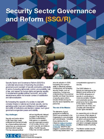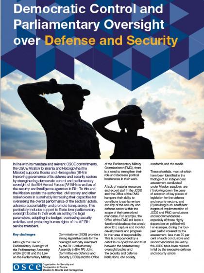 In line with its mandate and relevant OSCE commitments, the OSCE Mission to Bosnia and Herzegovina (the Mission) supports Bosnia and Herzegovina (BiH) in improving governance of its defense and security sectors by strengthening democratic control and parliamentary oversight of the BiH Armed Forces (AF BiH) as well as of the security and intelligence agencies in BiH. To this end, the Mission assists the authorities, civil society and other stakeholders in sustainably increasing their capacities for overseeing the overall performance of the sectors’ actors, advance accountability, and promote transparency. This particularly includes support to State-level parliamentary oversight bodies in their work on setting the legal parameters, adopting the budget, overseeing security activities, and protecting human rights of the AF BiH service members.