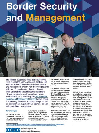 The Mission supports Bosnia and Herzegovina (BiH) in ensuring open and secure borders. This includes attaining an integrated border security and management system that effectively prevents all forms of cross-border crime and threats while still enabling the unhindered movement of persons, goods, services and commerce. Such assistance is framed by the OSCE Border Security and Management Concept which entails a whole-of-government approach and promotes co-operation among all relevant agencies as well as international co-operation.
