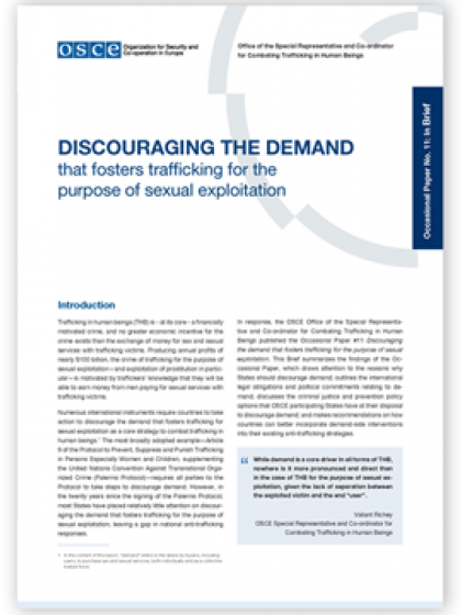 This Brief summarizes the findings of Occasional Paper No. 11 Discouraging the demand that fosters trafficking for the purpose of sexual exploitation, which draws attention to the reasons why States should discourage demand; outlines the international legal obligations and political commitments