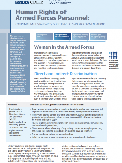 Women remain significantly underrepresented in the armed forces across the OSCE region. Women’s participation in the military goes beyond the question of representation, and encompasses recruitment, promotion and retention, working conditions, respect for family life, and issues of discrimination and sexual violence. Above all, women’s participation in the armed forces is about full respect for their human rights while appreciating their necessary contribution to the operational demands of a modern-day military.