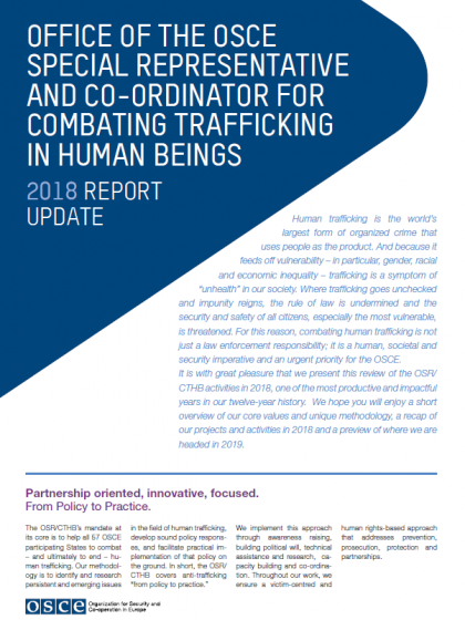 This Report Update provides a short overview of the core values and unique methodology of the OSCE Office of the Special Representative and Co-ordinator for Combating Trafficking in Human Beings, a recap of its projects and activities in 2018, and a preview of priority areas for 2019.