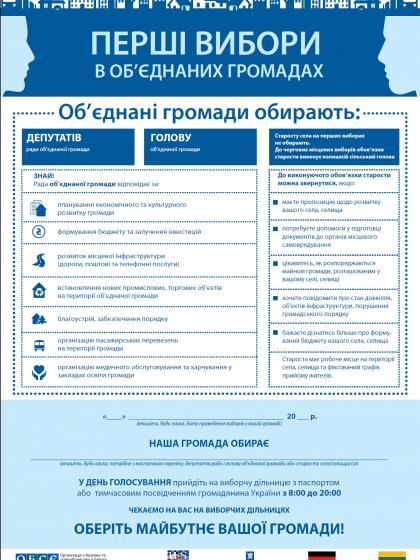 Poster in Ukrainian is devoted to the first elections in amalgamated communities and describes duties and responsibilities of the officials to be elected at the first elections. Available only in Ukrainian.
