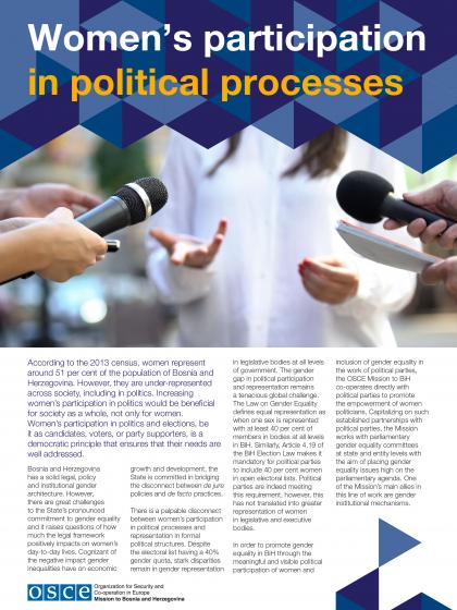 According to the 2013 census, women represent around 51 per cent of the population of Bosnia and Herzegovina. However, they are under-represented across society, including in politics. Increasing women’s participation in politics would be beneficial for society as a whole, not only for women. Women’s participation in politics and elections, be it as candidates, voters, or party supporters, is a democratic principle that ensures that their needs are well addressed.