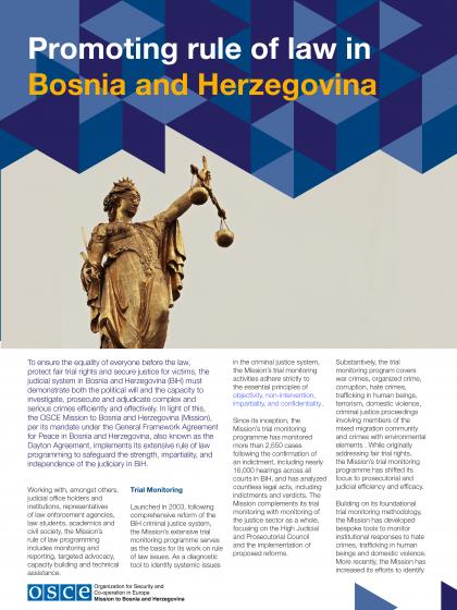 To ensure the equality of everyone before the law, protect fair trial rights, and secure justice for victims, the judicial system in Bosnia and Herzegovina (BiH) must demonstrate both the political will and the capacity to investigate, prosecute and adjudicate complex and serious crimes efficiently and effectively. In light of this, the OSCE Mission to Bosnia and Herzegovina (Mission), per its mandate under the General Framework Agreement for Peace in Bosnia and Herzegovina, also known as the Dayton Agreement, implements its extensive rule of law programming to safeguard the strength, impartiality, and independence of the judiciary in BiH.