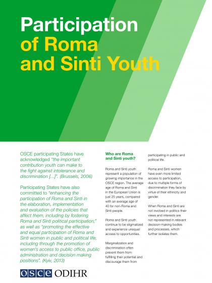 Roma and Sinti youth represent a population of growing importance in the OSCE region. The average age of Roma and Sinti in the European Union is just 25 years, compared with an average age of 40 for non-Roma and Sinti people. Roma and Sinti youth continue to be stigmatized and experience unequal access to opportunities. Marginalization and discrimination often prevent them from fulfilling their potential and discourage them from participating in public and political life. Roma and Sinti women have even more limited access to participation, due to multiple forms of discrimination they face by virtue of their ethnicity and gender. When Roma and Sinti are not involved in politics their views and interests are not represented in relevant decision-making bodies and processes, which further isolates them.