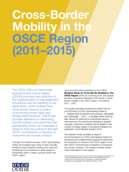 Using the information published in the ODIHR Baseline Study on Cross-Border Mobility in The OSCE Region (2014) as a starting point, this update provides a statistical overview of the trends in cross-border mobility in the OSCE region in the period between 2011 and 2015.