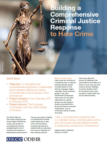 The OSCE Office for Democratic Institutions and Human Rights (ODIHR) has continuously worked on countering hate crime by strengthening the role of criminal justice systems in addressing this phenomenon. The two-year project “Building a Comprehensive Criminal Justice Response to Hate Crime” will use tailored, innovative approaches at national levels as a laboratory and source of inspiration for transnational solutions.