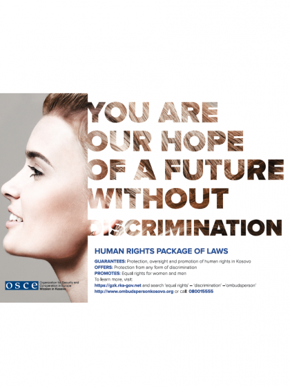The poster of the campaign to promote the human rights package of laws in Kosovo aims to inform the general public about their rights and novelties brought by the package which includes the Law on Gender Equality, Law on Protection from Discrimination, Law on the Ombudsperson and the available resources to exercise those rights. Emphasis is added on the role and responsibilities of the Ombudsperson in implementing this legislation.