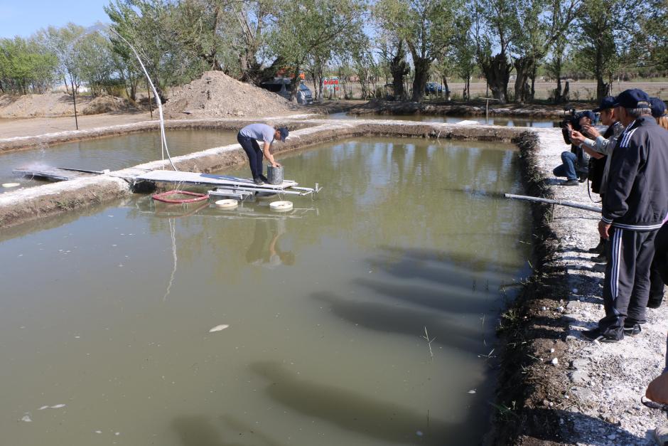 Участники семинара осматривают прудовое рыболовное хозяйство «Суиндик» в качестве примера устойчивого рыболовного хозяйства в регионе, Кызылорда, 29 апреля 2015 г.