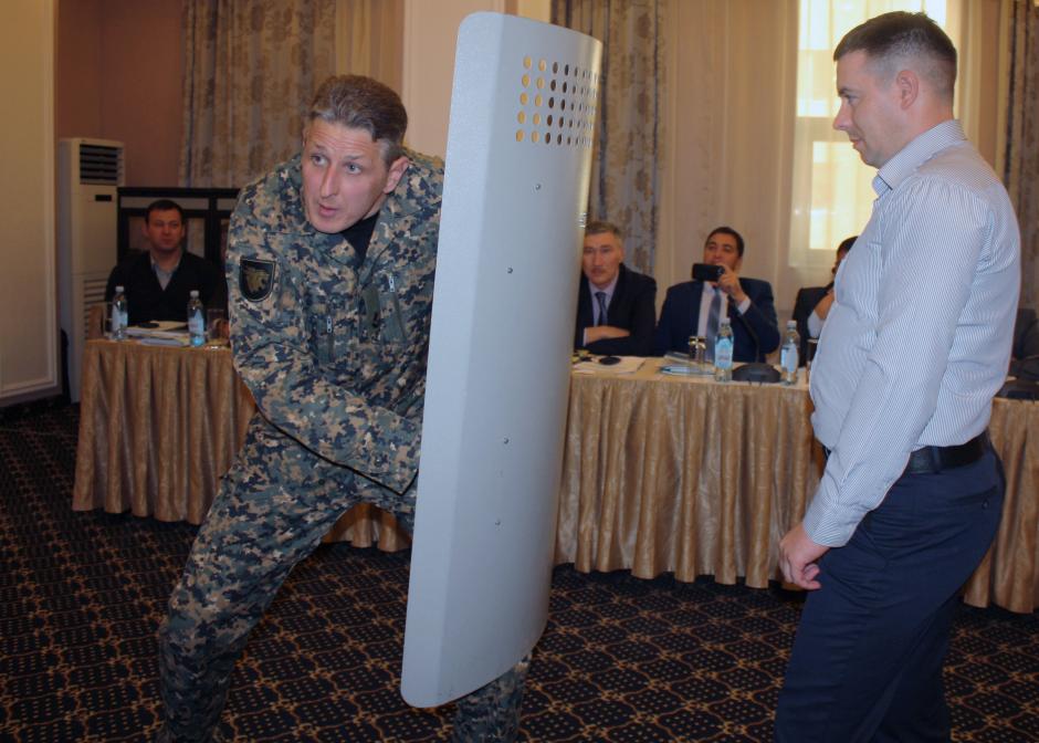 Полицейский тренер ОБСЕ из Литвы демонстрирует надлежащую технику использования защитного щита. Астана, 15 сентября 2015 г.