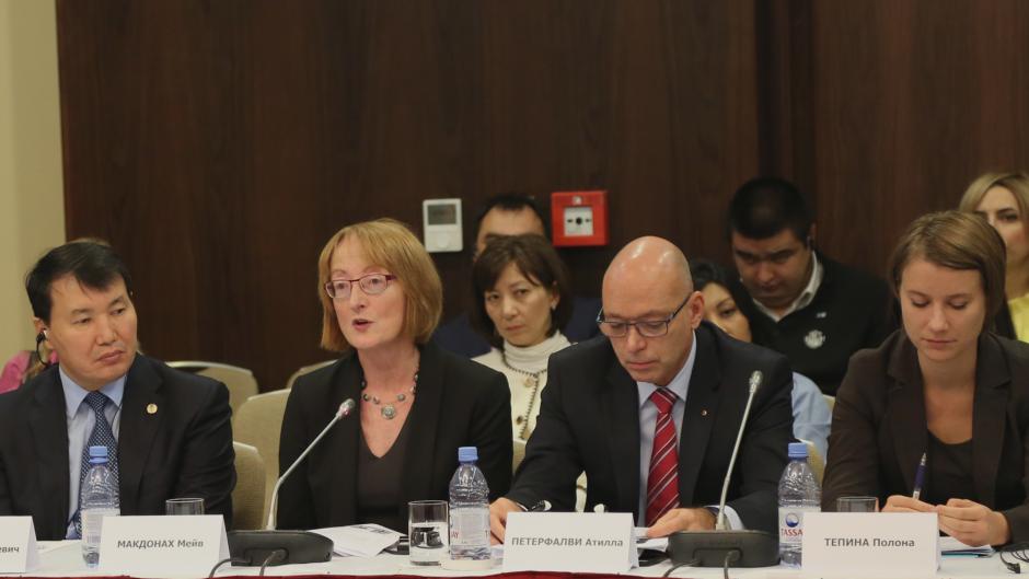 Юридическое заключение по законопроекту о доступе к информации было представлено экспертом ОБСЕ из Ирландии, профессором Мэв МакДонах(в центре), Астана, 25 сентября 2015 г.