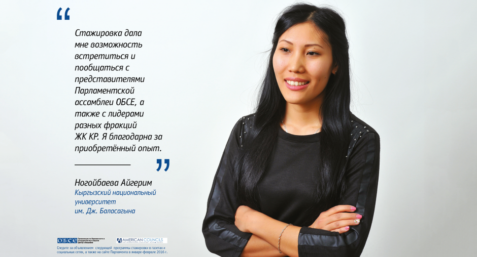 Айгерим Нагойбаева, студентка Кыргызско-Национального Университета сказала: «Стажировка дала мне возможность встретиться и пообщаться с представителями Парламентской ассамблее ОБСЕ, а также с лидерами разных фракций. Я благодарна за приобретенный опыт».