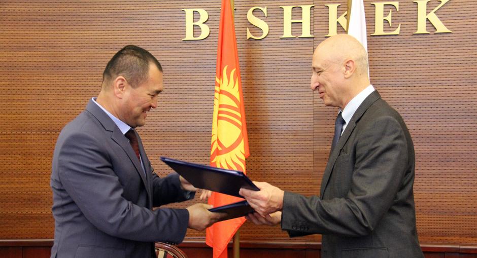 Посол Сергей Капинос, Глава Центра ОБСЕ в Бишкеке и Рустам Мамасадыков, Заместитель председателя Государственного комитета национальной безопасности (ГКНБ), Директор Антитеррористического центра ГКНБ, на церемонии подписания соглашения о сотрудничестве, Бишкек, 19 июля 2016.
