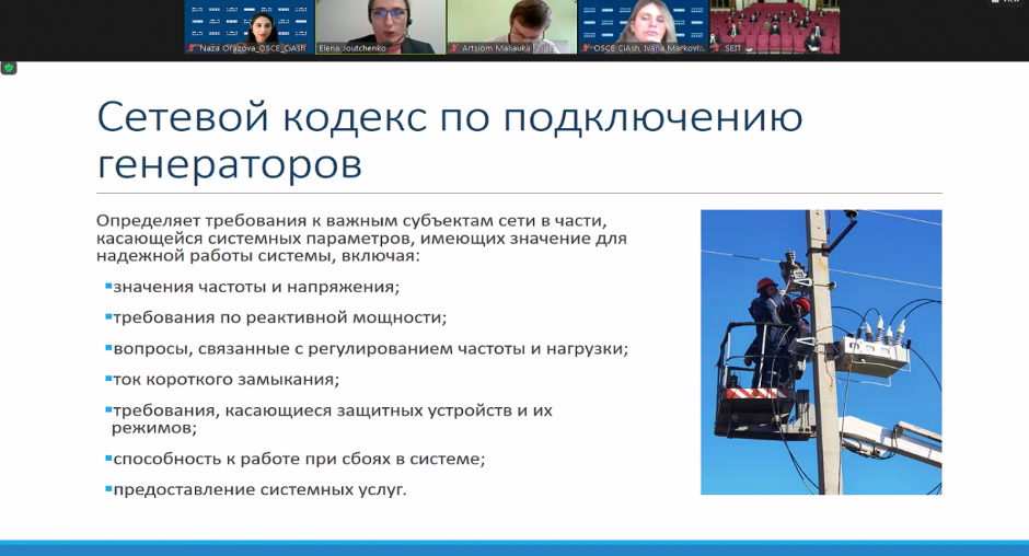 Центр ОБСЕ в Ашхабаде организовал 25 и 26 апреля 2022 года онлайн - семинар, посвященный передаче электроэнергии, вырабатываемой солнечными, ветряными и комбинированными станциями, в центральную электросеть.