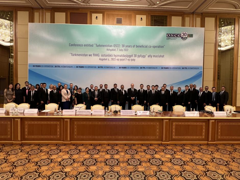 Участники конференции, посвященной 30-летию сотрудничества между ОБСЕ и Туркменистаном, состоявшейся в Ашхабаде 7 июля 2022 года.