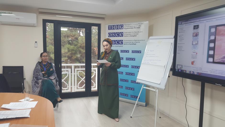 Участница представляет результаты обсуждения в группе во время организованного ОБСЕ семинара по гендерным ролям, гендерным отношениям и домашнему насилию, г. Ашхабад, 30 ноября 2023 года/ОБСЕ