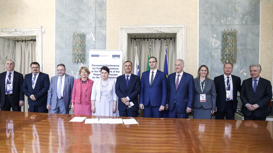 Представители сторон, посредников и наблюдателей во время переговоров по приднестровскому урегулированию в формате 5+2 в Риме, 30 мая 2018.