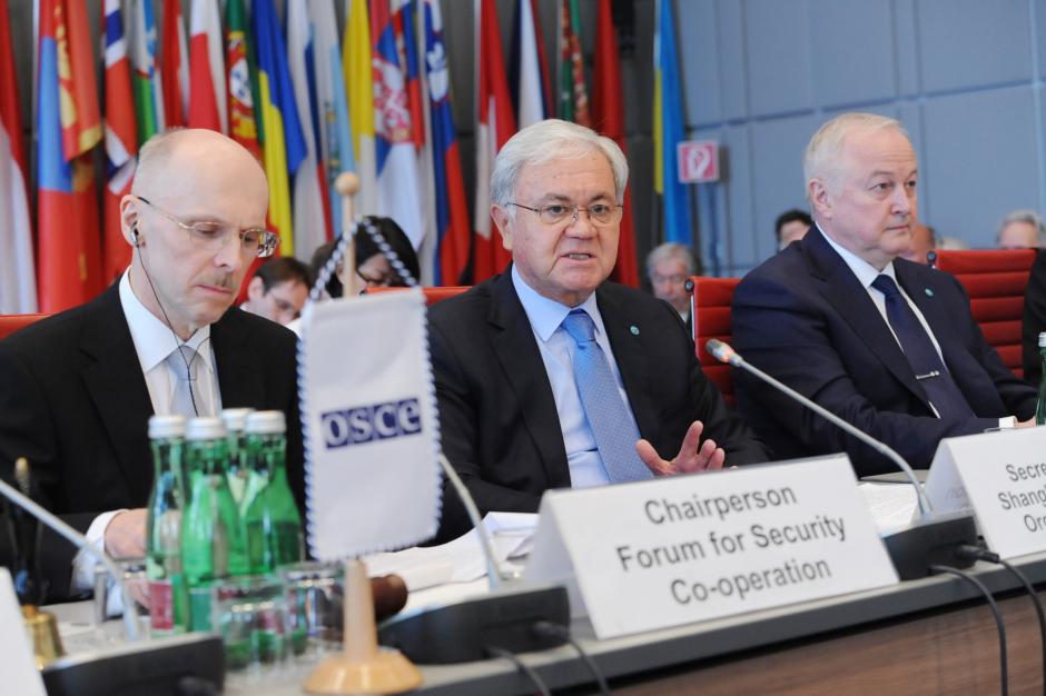 (слева направо): Председатель Форума по сотрудничеству в области безопасности (ФСОБ) Андрей Воробьев, Генеральный секретарь Шанхайской организации сотрудничества (ШОС) Рашид Алимов и директор Исполнительного комитета Региональной антитеррористической структуры ШОС Евгений Сысоев на заседании ФСОБ в Вене 10 мая 2017 года