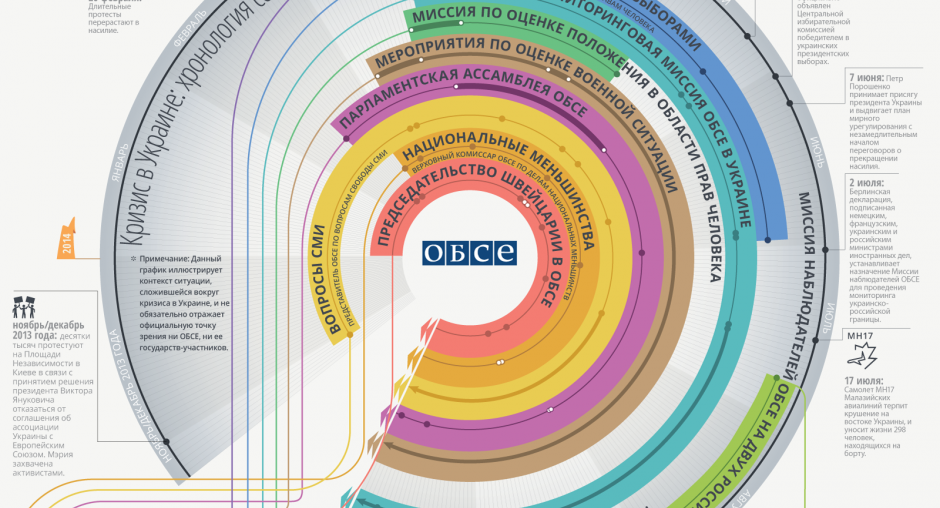 Данная инфографика представляет основные вехи с ноября 2013 года. Последние обновления по кризису в Украине можно найти на вебсайте ОБСЕ: osce.org/ukrainemonitoring.