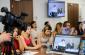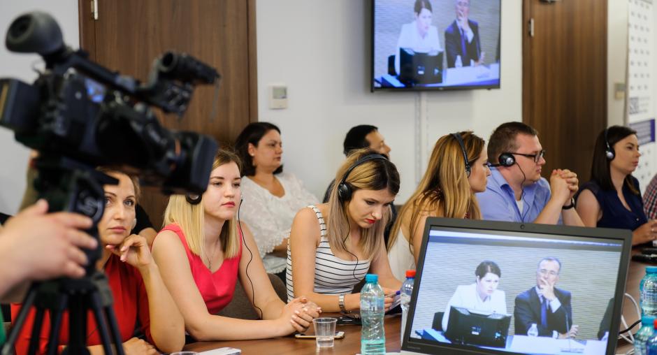 Миссия ОБСЕ в Молдове предоставляет равный доступ к информации о процессе урегулирования журналистам с обоих берегов реки Днестр. Журналисты смотрели прямую трансляцию пресс-конференции по итогам переговоров в формате «5 + 2» в офисе Миссии ОБСЕ в Кишиневе по видеосвязи с Римом 30 мая 2018 года. (ОБСЕ/Игорь Скимбэтор)