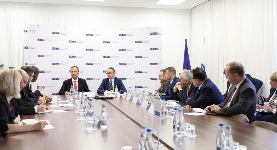 Посредники и наблюдатели в рамках переговорного процесса по приднестровскому урегулированию в штабе Миссии ОБСЕ в Молдове перед их встречами с руководством Молдовы и Приднестровья, 12 июля 2019 года, Кишинев. (ОБСЕ/Игорь Скимбэтор)