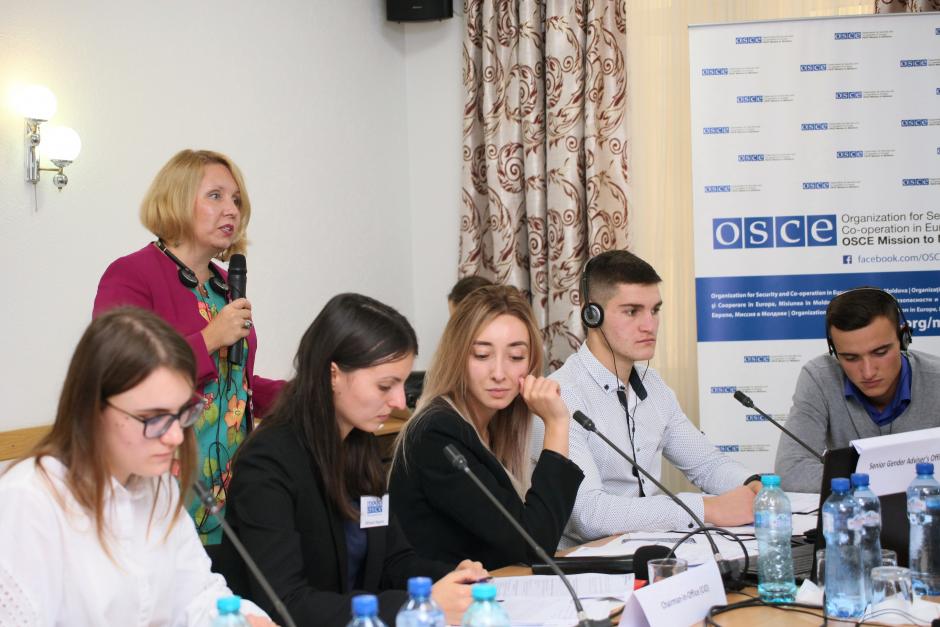 Международный эксперт Ида Мантон рассказывает участникам модели ОБСЕ об окончательной симуляции - завершении «Дополнения к Плану действий по поддержке гендерного равенства», Вадул-луй-Водэ, Молдова, 29 сентября 2019 года.