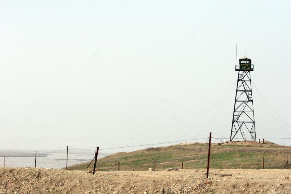 Таджикская пограничная вышка вблизи моста над рекой Пяндж, на таджикско-афганской границе, 29 февраля 2008 г.