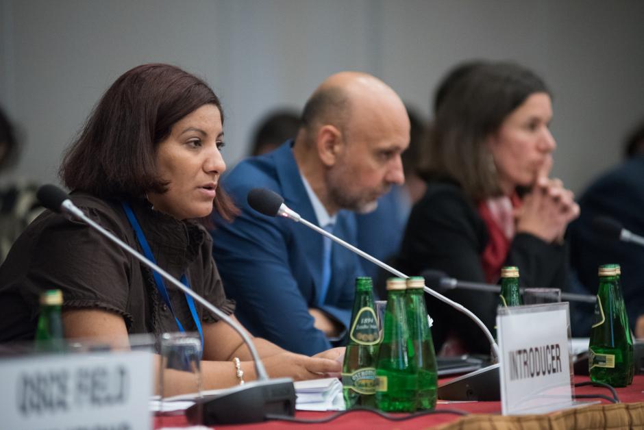 Активистка движения рома, член Государственного совета Чешской Республики по делам национального меньшинства рома Луциэ Фукова выступает перед участниками заседания на тему толерантности и недискриминации с особым упором на вопросах рома и синти, которое прошло в рамках Совещания по рассмотрению выполнения обязательств, посвященных человеческому измерению, 28 сентября 2016 г., Варшава