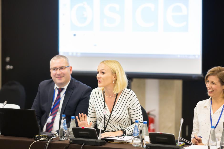 Игорь Личина, эксперт по правам человека Миссии ОБСЕ в Боснии и Герцеговине (слева), Анита Данка, советник БДИПЧ по правам человека (в центре) и Андреа Юдит Тот, руководитель отдела программ и коммуникаций Европейского центра некоммерческого права (справа), обсуждают проблемы и передовую практиву в области обеспечения правопорядка во время публичных собраний в соответствии с нормами соблюдения прав человека в западно-балканском регионе на мероприятии в рамках Совещания по рассмотрению выполнения обязательств в области человеческого измерения ОБСЕ. 17 сентября 2018 г.