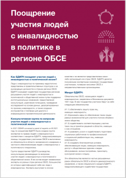 Люди с инвалидностью по-прежнему недостаточно представлены в правительственных структурах и на руководящих должностях в странах региона ОБСЕ. БДИПЧ оказывает содействие государствам регионав расширении участия людей с инвалидностью в политической и общественной жизни путем поддержки институциональных изменений, предоставления консультаций, укрепления потенциала, проведения исследований на основе данных, дезагрегированных по признаку инвалидности, а также создания инструментов и платформ для диалога и информационно-просветительской деятельности.