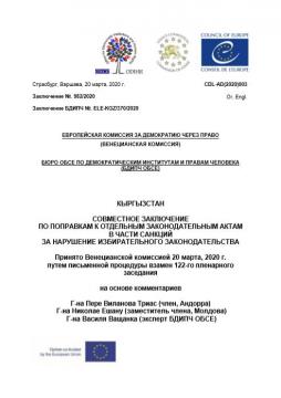 Совместное заключение Венецианской комиссии Совета Европы и БДИПЧ ОБСЕ по поправкам к отдельным законодательным актам в части санкций за нарушение избирательного законодательства Кыргызской Республики