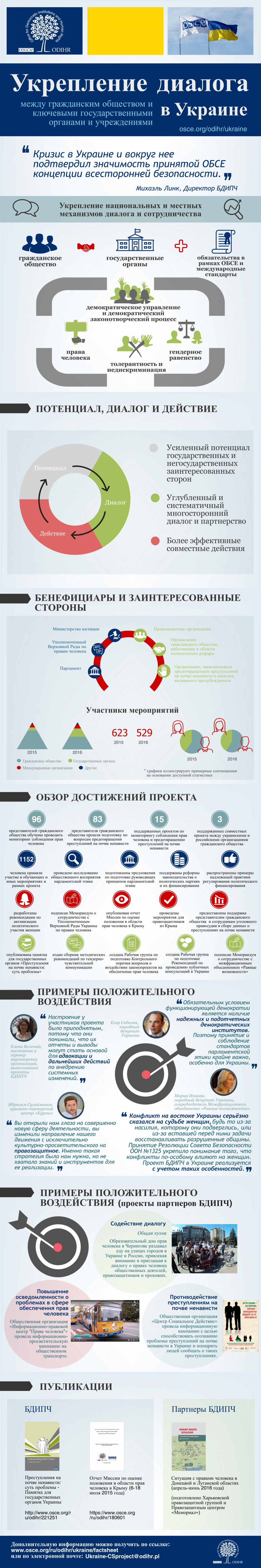 С самого начала кризиса в Украине и вокруг нее БДИПЧ играет важную роль в реагировании ОБСЕ на этот кризис. Один из ключевых проектов Бюро нацелен на укрепление диалога между гражданским обществом и ключевыми государственными органами и учреждениями в Украине. В данной инфографике представлен обзор этой деятельности.