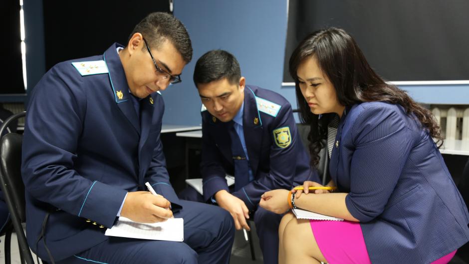 Участники обучающего семинара обсуждают эффективные методы взаимодействия со СМИ. Поселок Косшы (возле Астаны), Казахстан. 1 октября 2018 года.